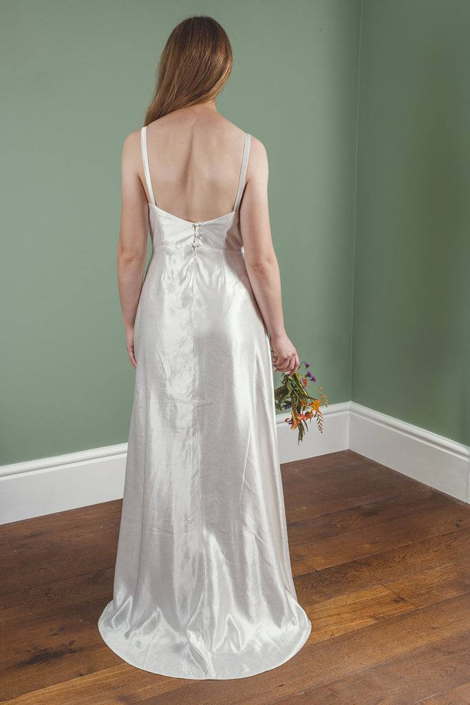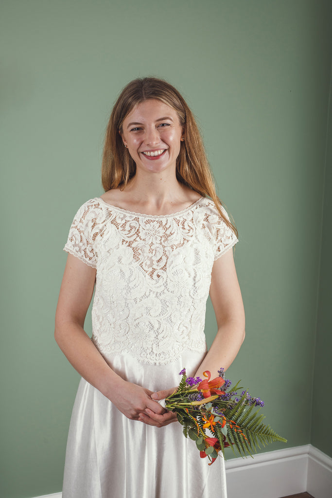 This classic and simple bridal dress is handmade in a beautiful ivory hemp/silk fabric, with a flattering 'V' neckline at the front and back. The skirt is full and drapey and falls into a small train at the back. It closes with a concealed zip and little covered buttons at the back. This simple yet versatile dress works really well with our lace tops.
