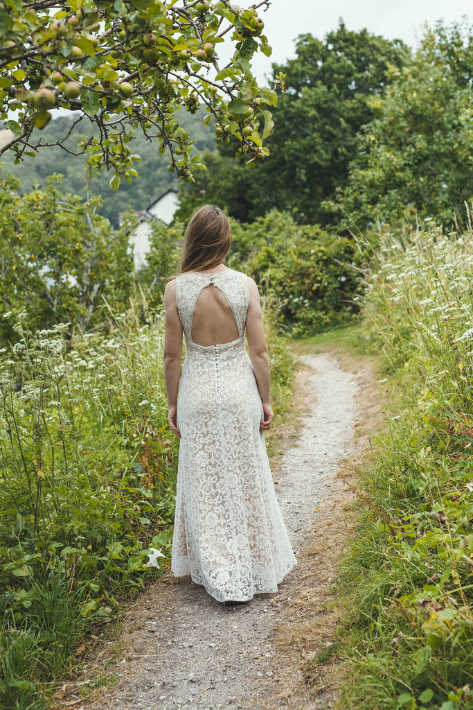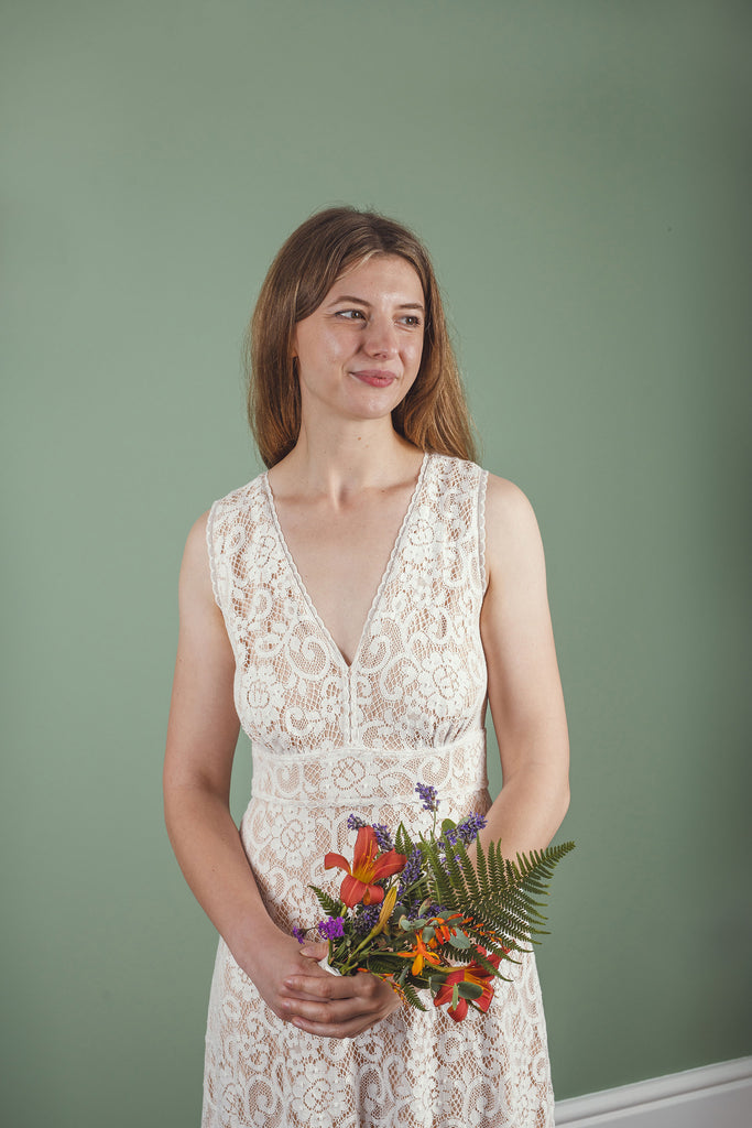 This long, sleeveless V-neck dress is handmade to order in a beautiful cotton lace fabric and lined in a tea rose coloured organic cotton jersey. It has a flattering V neck at the front finished with trimming lace, fitted to a high waist band. It has an open back which buttons at the back of the neck and waistband with rouleaux loops and little covered buttons. It is lined in a soft organic cotton jersey, which makes this dress feel incredibly comfortable to wear.