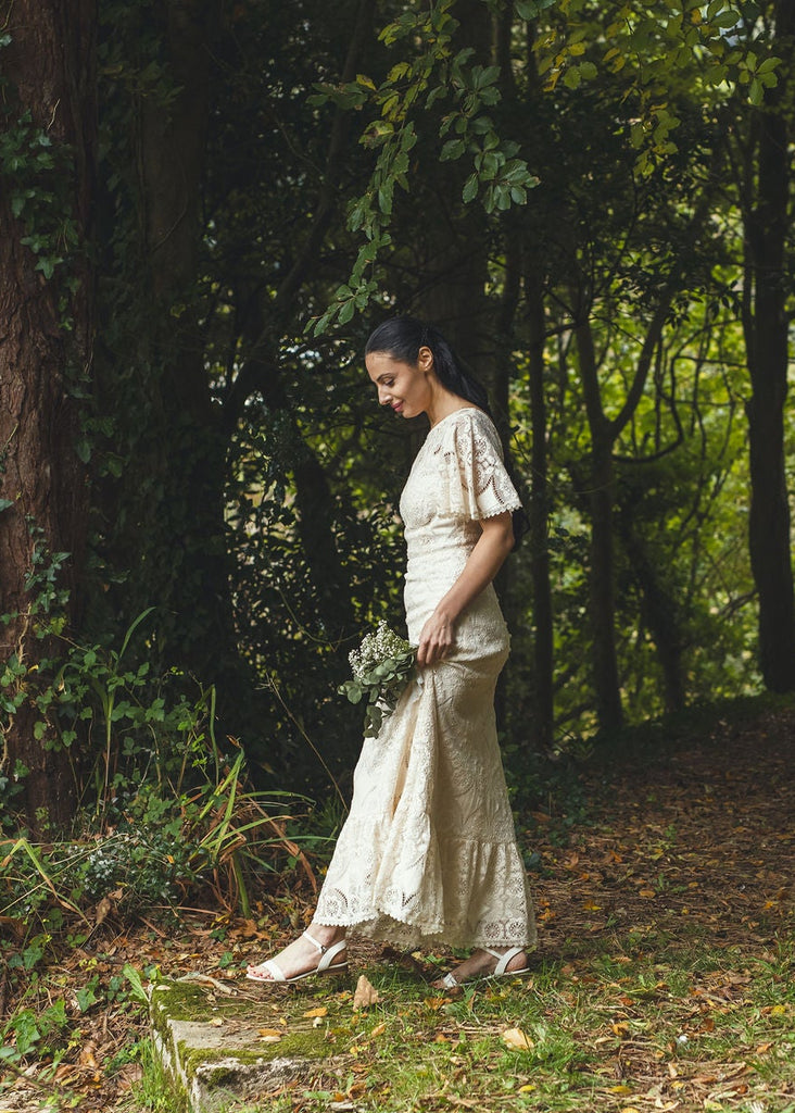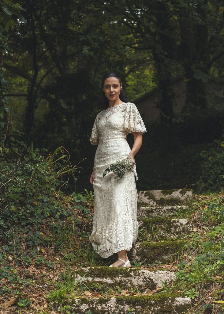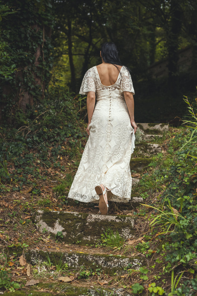 It's a classic and feminine shape with a flattering high neckline at the front and scooped low back, with loose fluttering sleeves. The dress finishes with a gathered hem panel and is edged at the hem with a beautiful curved trimming lace. It buttons at the back with rouleaux loops and little covered buttons. It comes with a full length slip made in hemp/silk (can also be made with an organic cotton slip if preferred).