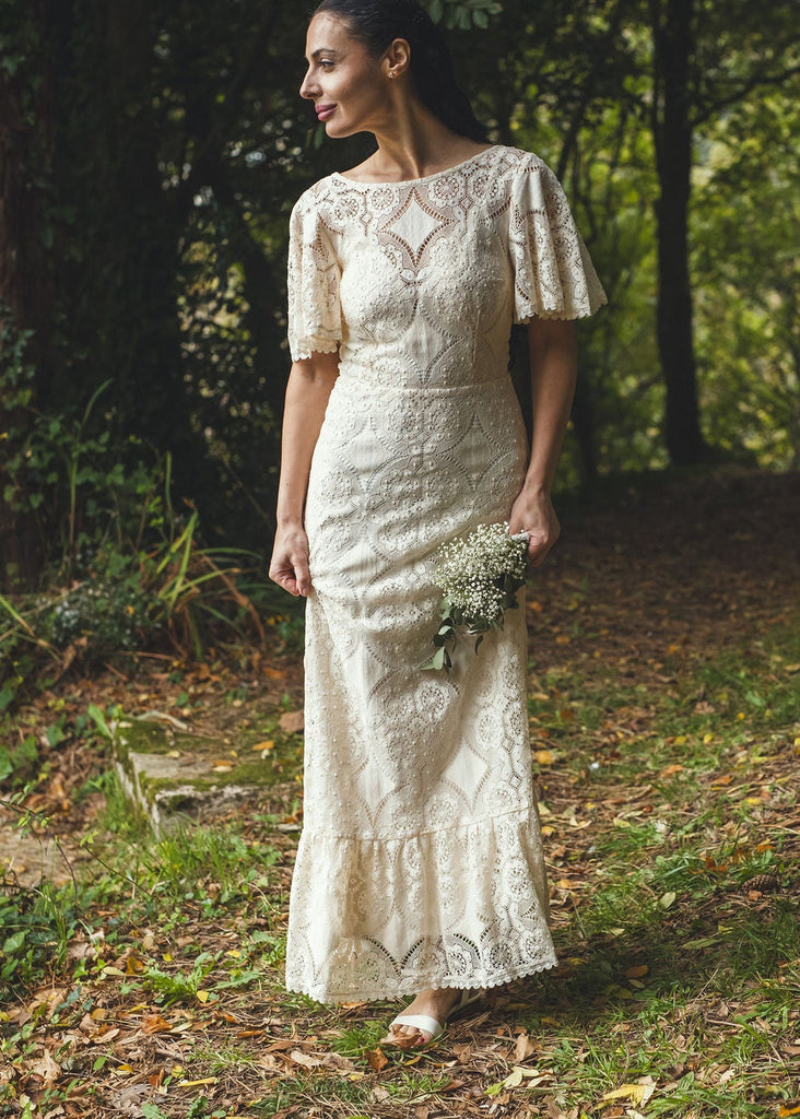 This long lace dress is made in a beautiful cream cotton lace fabric (also available in off-white). The beautiful lace is made in England using traditional methods.