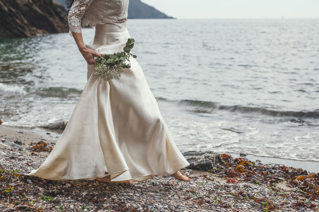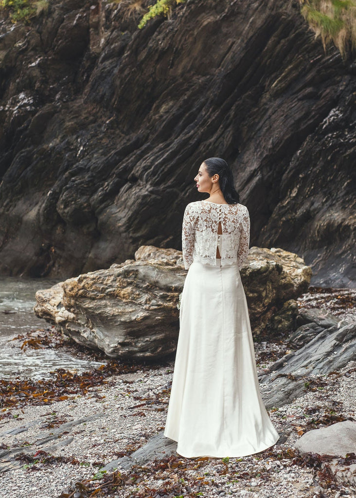 This classic bridal skirt is handmade in beautiful cream hemp/silk satin. The skirt closes at the back, with a concealed zip and 3 loops and little covered buttons on the waistband. The skirt is flat fronted, with a full hem and a small train at the back. It is fully lined in organic cotton and has pockets in the side seam.
