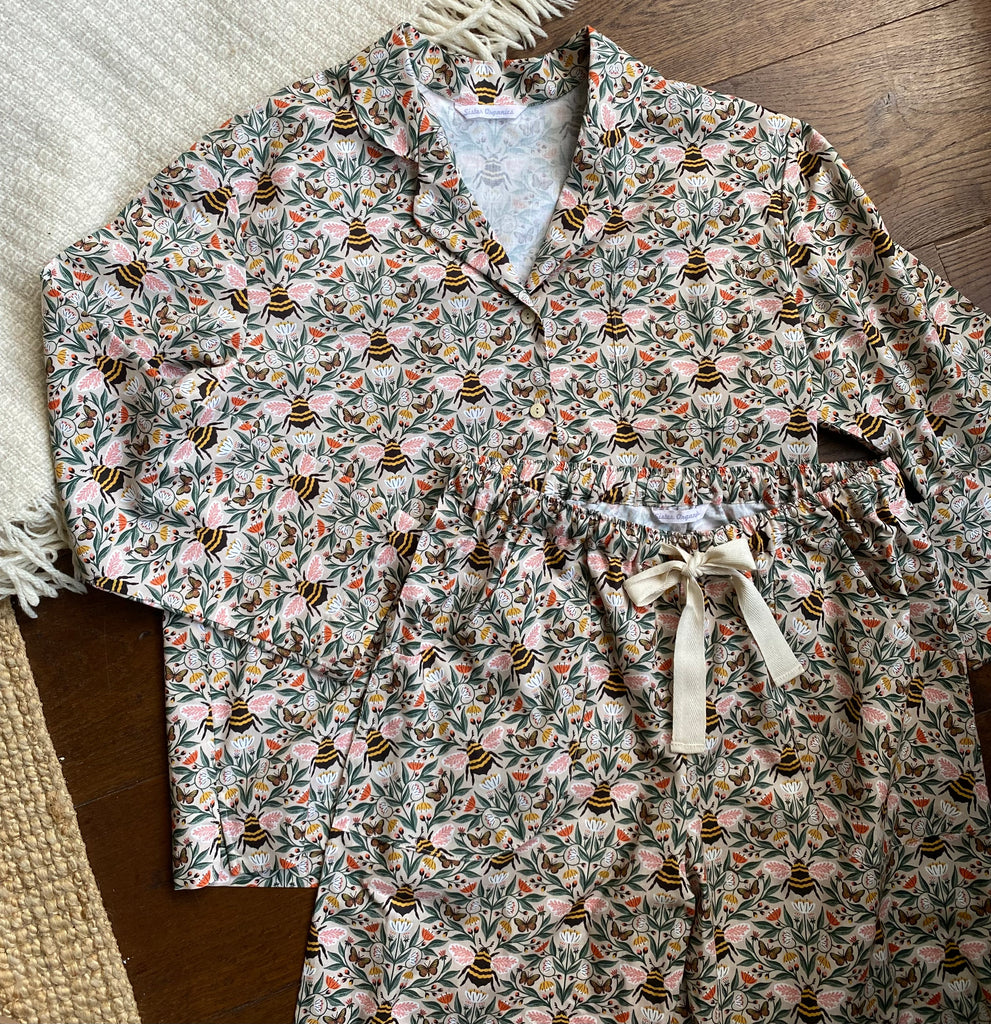 Limited edition pyjama trousers and shirt for women, made from premium 100% organic cotton in a beautiful bee print design.