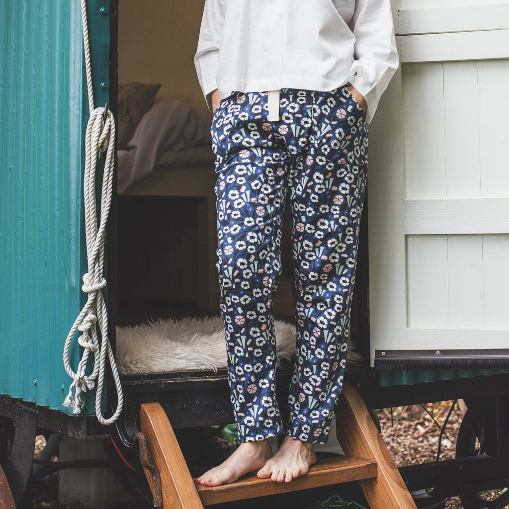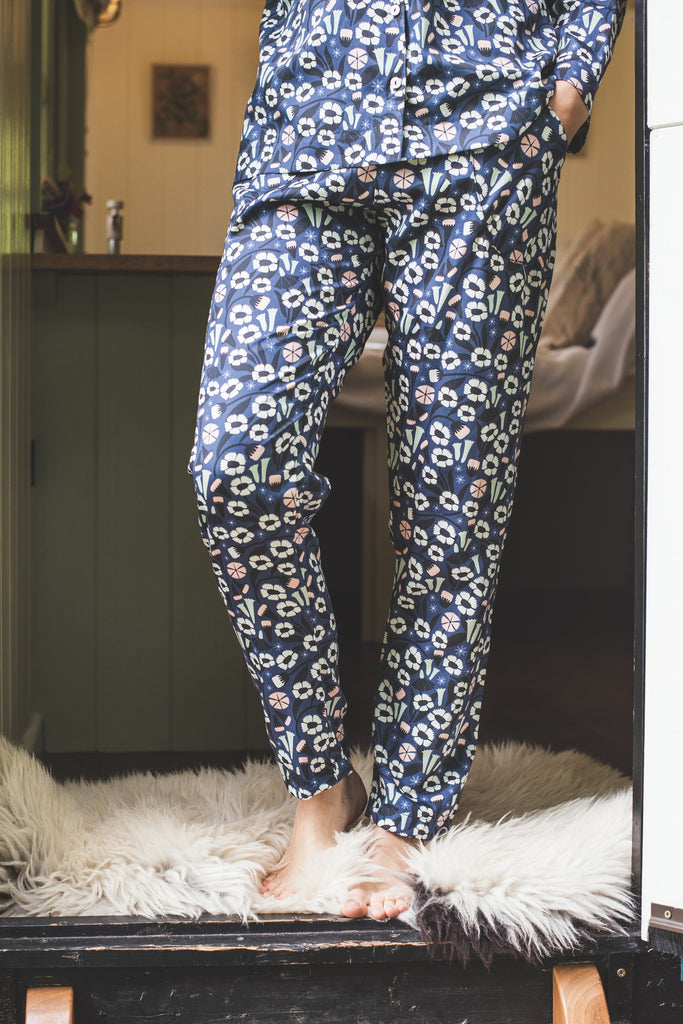 Limited edition pyjama trousers for women, made from 100% organic cotton sateen in a beautiful dark floral design print. Handmade to order, in Devon, England.