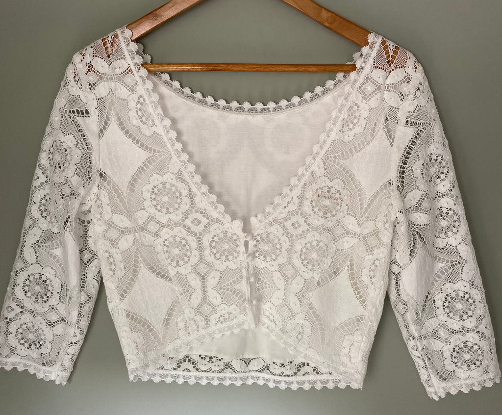 A lined version of our classic button back bolero. This top is handmade in my favourite diamond design off-white cotton lace fabric, with the front lined in a lightweight organic cotton jersey. The delicate lace is made in England using traditional methods. It has 3/4 sleeves and buttons up at the back with rouleaux loops and little covered buttons, finished with a beautiful contoured cotton lace trim.