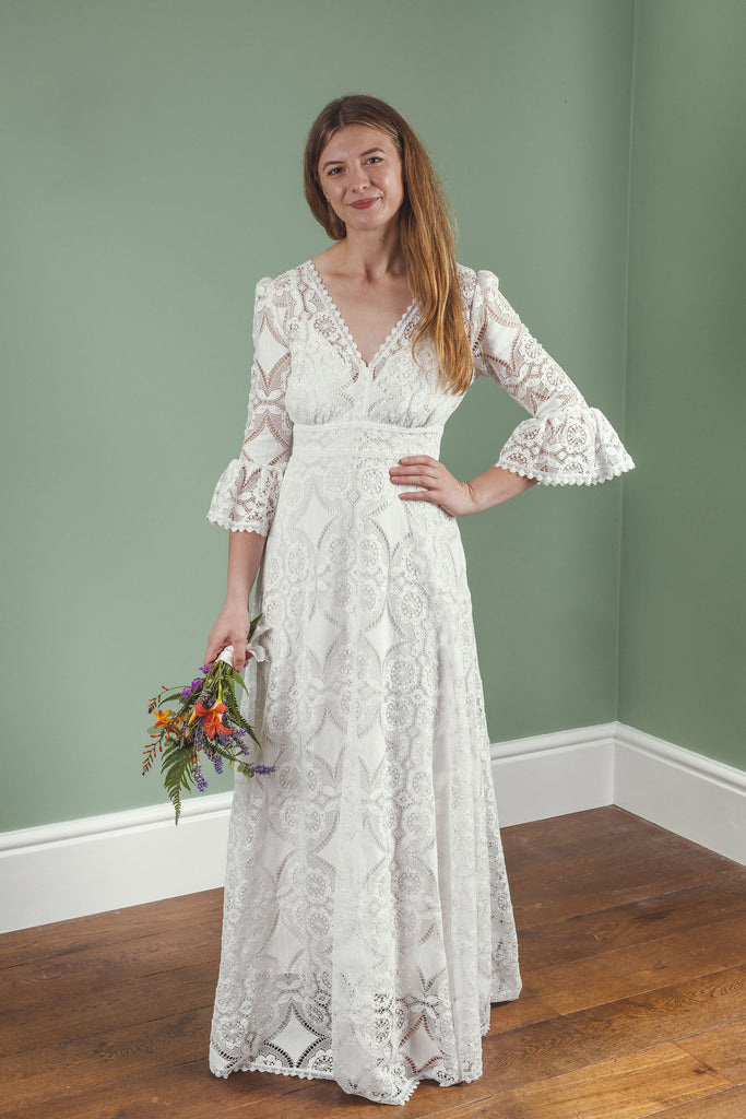 This long V-neck lace dress is made in a beautiful off-white cotton lace fabric (also available in cream). The beautiful lace is made in England using traditional methods.